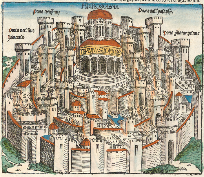 Cependant, ce n’est pas tant pour le texte que la Chronique occupe une telle place dans l’histoire du livre mais bien pour la richesse et le foisonnement de ses illustrations, à l’instar des représentations de villes européennes, comme ici Jérusalem, Venise, Paris ou Marseille…