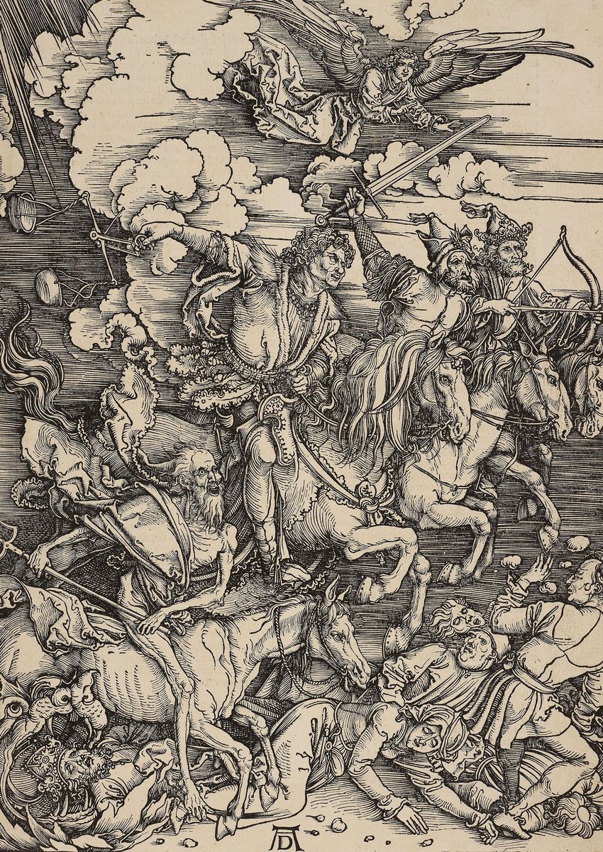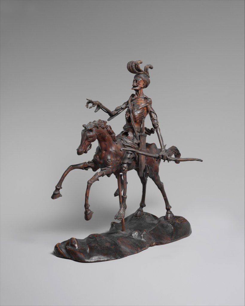 7. …ou voilà que déferlent les terribles chevauchées où la mort est accompagnée par d’autres maux, ses féaux ou ses compagnons, comme chez Dürer avec la Famine, la Discorde et la Guerre ou avec le Diable lui-même.